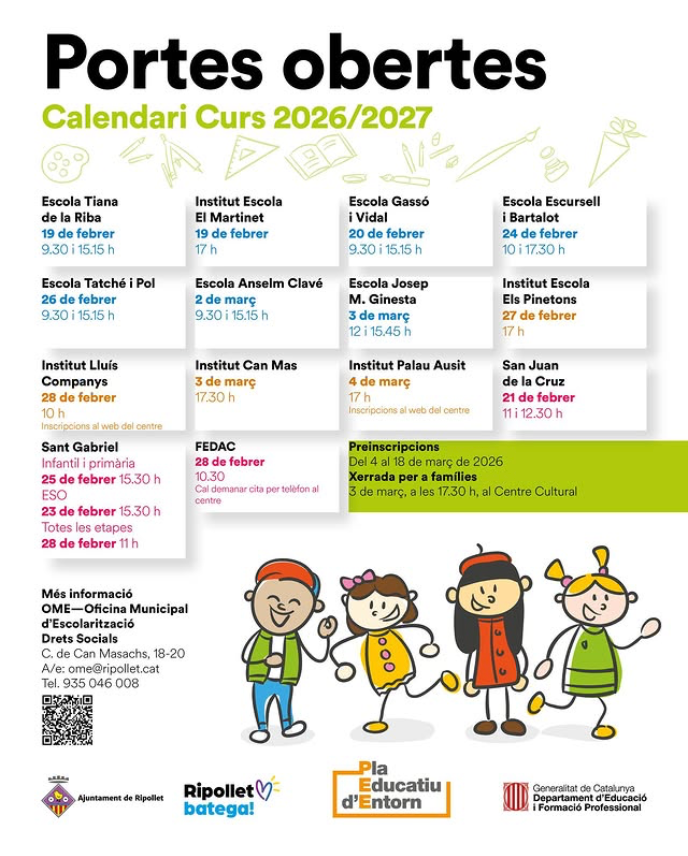 A més, el 3 de març a les 2/4 de 6 de la tarda, el Centre Cultural de Ripollet acollirà una xerrada informativa adreçada especialment a les famílies amb infants que iniciaran I3. La sessió servirà per orientar-les en el procés d’escolarització i resoldre qüestions pràctiques sobre la tria de centre.