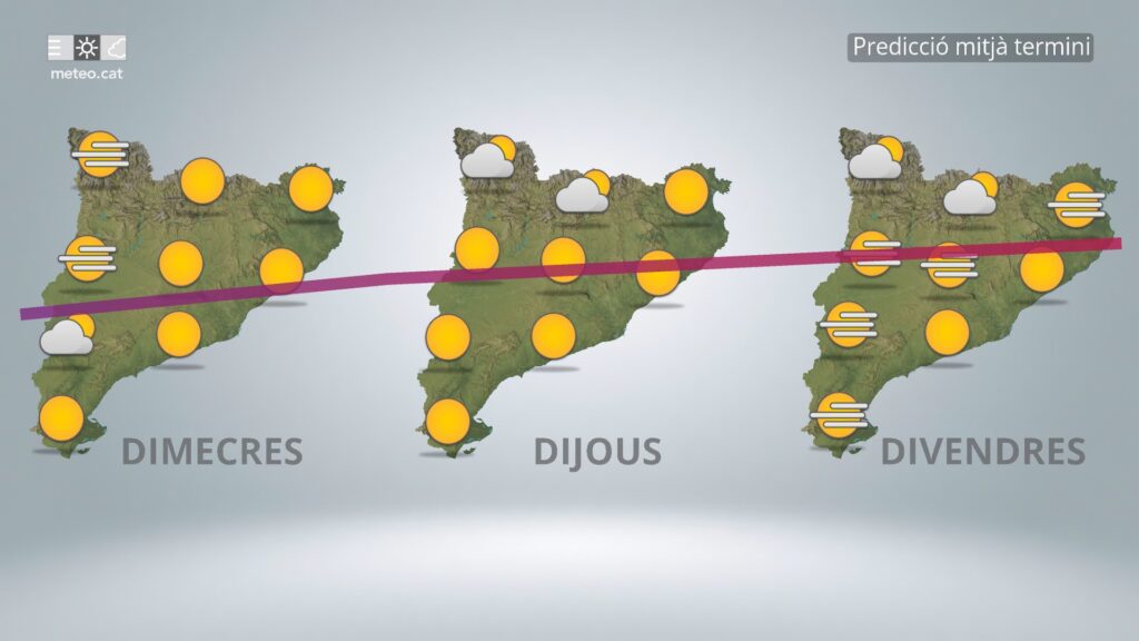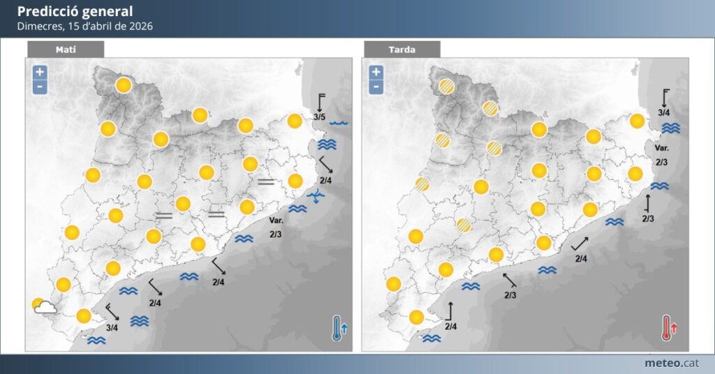 De cara a dimecres, el cel es presentarà amb intervals de núvols, però sense risc destacable de precipitacions. Les temperatures es mouran entre els 10 °C de mínima i els 23 °C de màxima, configurant un dia suau, amb ambient fresc a primera hora del matí i al vespre. Aquesta situació permetrà gaudir d’activitats a l’aire lliure sense grans condicionants meteorològics.