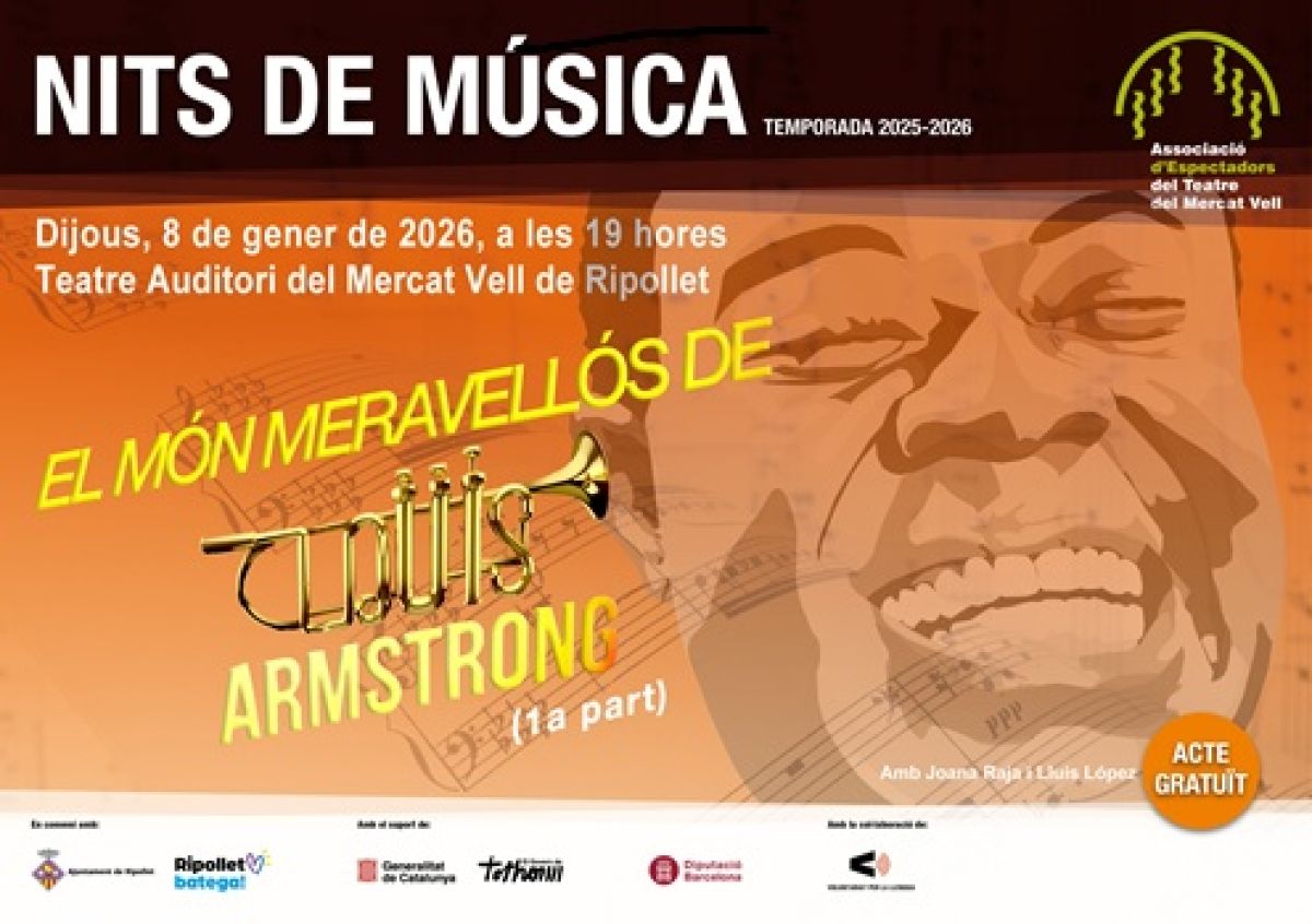 L’Associació d’Espectadors del Teatre del Mercat Vell dedicarà dues sessions de les Nits de Música a la figura irrepetible de Louis Armstrong, un dels músics afroamericans més influents del segle XX i una icona universal del jazz. El cicle, que tindrà lloc entre els mesos de gener i febrer de 2026, vol reivindicar una faceta menys coneguda del trompetista de Nova Orleans: la seva intensa presència en el cinema.
