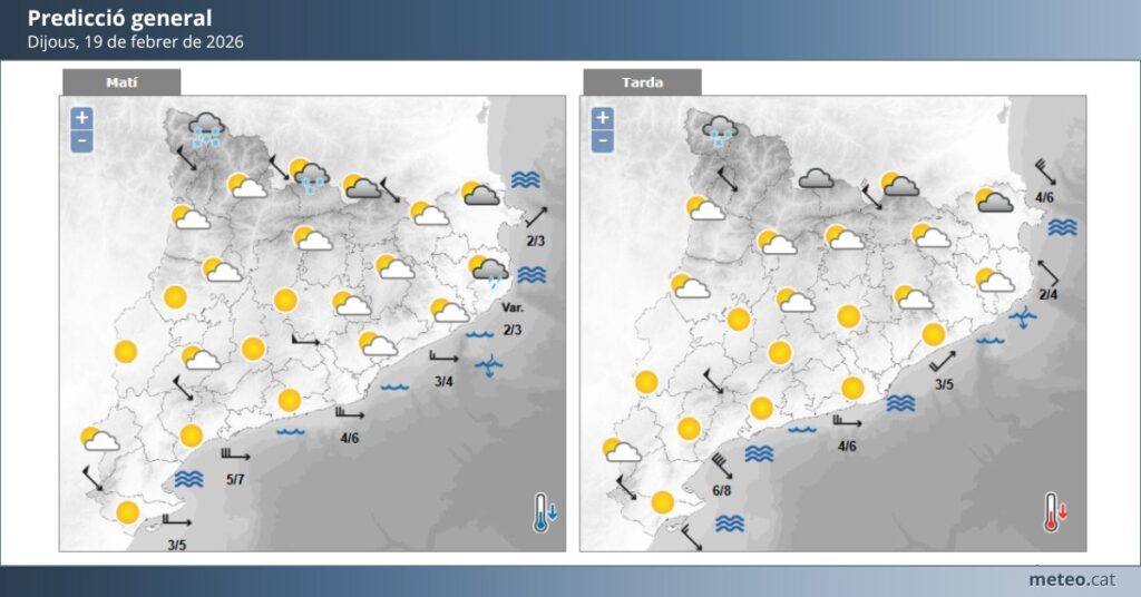 La jornada de dijous començarà amb un ambient fresc, amb temperatures mínimes que es mouran al voltant dels 6 a 9 graus. El cel presentarà intervals de núvols, alternant estones de cobertura més alta amb clarianes.