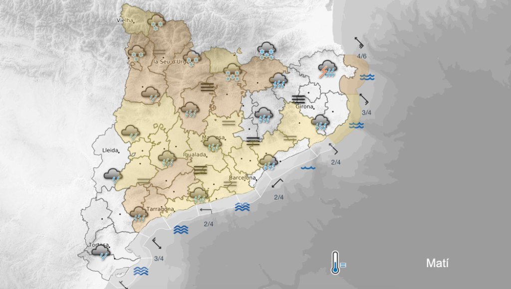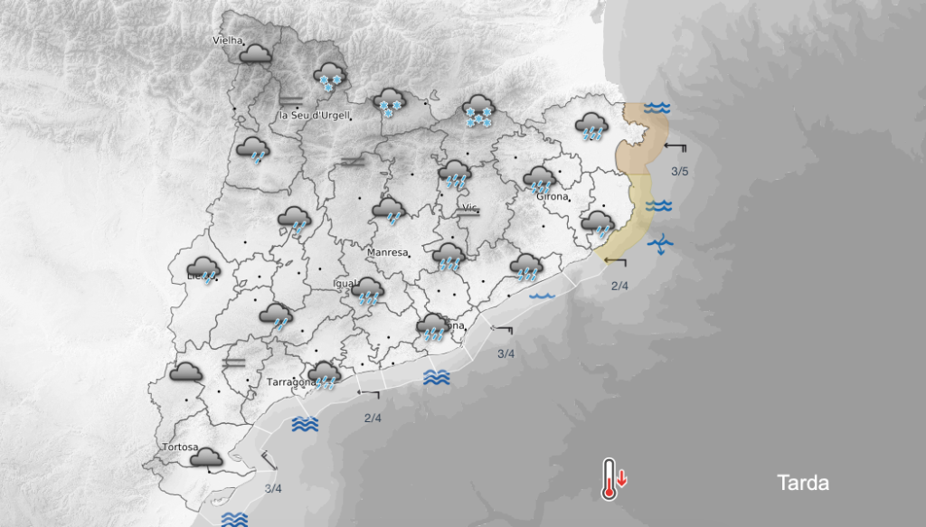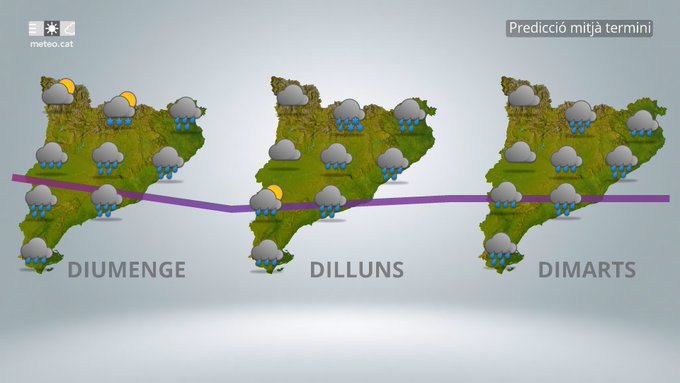 La situació es mantindrà molt similar dilluns, amb predomini dels núvols i un ambient humit. Tot i que les precipitacions podrien ser menys intenses que diumenge, no es descarta que es repeteixin alguns episodis de pluja feble. Les temperatures continuaran sense grans canvis, amb valors màxims propers als 12 °C i mínims entre 9 i 10 °C.