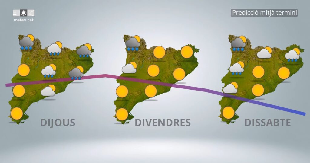 L’endemà, divendres 23 de gener, el temps podria mostrar una lleu millora, tot i que encara amb nuvolositat abundant i alguna precipitació dispersa. Les temperatures màximes podrien repuntar lleugerament fins als 14 graus, mentre que les mínimes baixarien, situant-se entre els 3 i 5 graus, fet que mantindrà l’ambient clarament hivernal.