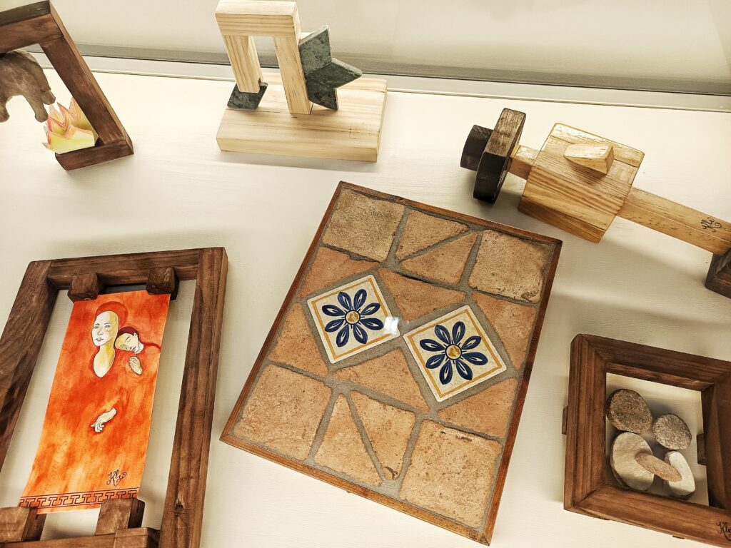 — A l’exposició també hi ha peces tridimensionals. D’on surt aquest vessant? — Abans de centrar-me tant en el dibuix, feia coses petites amb fusta. He treballat molts anys en el món de la ceràmica, i ara aprofito materials com la fusta de pi que trobo o que es descartaria. Les retallo i en faig figures.